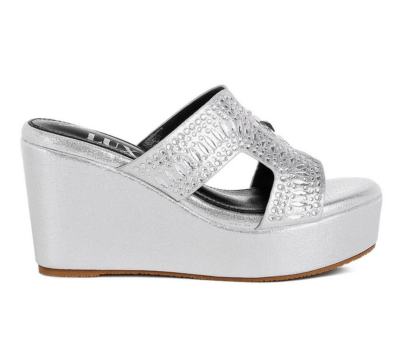 Women's London Rag Marnier Wedges Designed to dazzle, these rhinestone-adorned wedge sandals bring statement sparkle to any outfit. Featuring cut-out detailing and a soft shimmer finish, they pair beautifully with formalwear or evening looks. The cushioned insole keeps your feet supported for hours, making them the ideal event-ready heels.