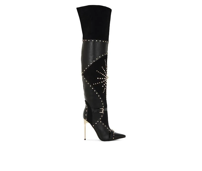 Women's London Rag Medira Knee High Boots Bold stiletto boots combine striking embellishments with a sleek pointed silhouette. The mixed faux leather and microfiber upper creates layered texture while stud and diamante accents add dramatic detail. Double buckle straps across the ankle and vamp enhance the edgy aesthetic. Finished with a tall stiletto heel and zipper closure, this pair delivers standout fashion appeal.