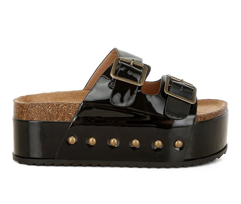 Women's London Rag Merton Footbed Sandals Edgy flatform sandals deliver bold styling with a modern slip-on silhouette. The patent faux leather upper adds shine while stud embellishments bring standout attitude. Buckle straps across the vamp provide an adjustable fit while enhancing the design. Finished with a chunky flatform sole and open round toe, this pair adds statement style to casual outfits.