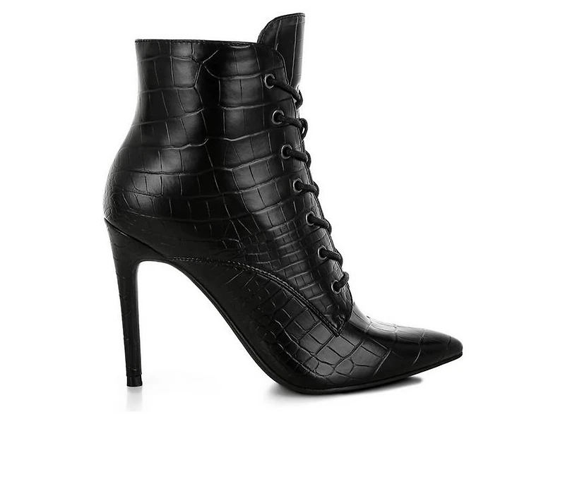 Women's London Rag Mesta Heeled Boots Croco-textured boots bring striking texture and bold styling to a classic silhouette. The faux leather upper features an allover croco pattern that adds depth and dimension. A lace-up front detail enhances the design while the tall stiletto heel delivers dramatic elevation. Finished with a zipper closure and pointed toe, this pair adds confident edge to dressy outfits.