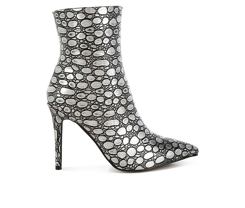 Women's London Rag Moolah Heeled Boots Bold height and sharp structure define these statement ankle boots. Designed with a faux leather upper and patterned embossment detail, this silhouette delivers standout texture. The closed pointed toe enhances the sleek profile, while the side zipper closure allows for easy wear. Set on a striking 4-inch stiletto heel with a durable TPR outsole, this pair commands attention.