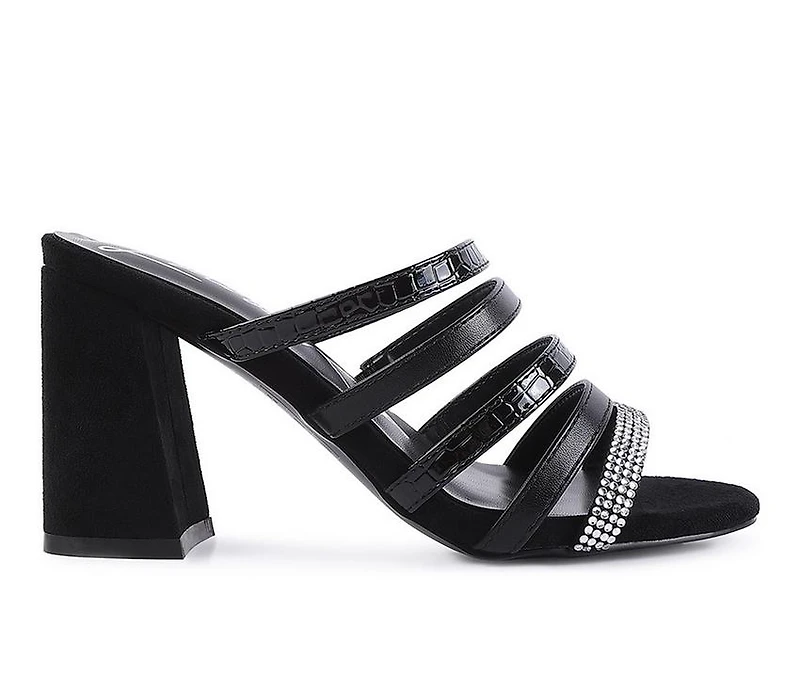 Women's London Rag Peaches Dress Sandals High Block heeled sandals multi-strap sandals with croc textured mono tone straps and diamante detail; the edgy high heel sliders have light cushioning which cuts strain and looks good on feet.