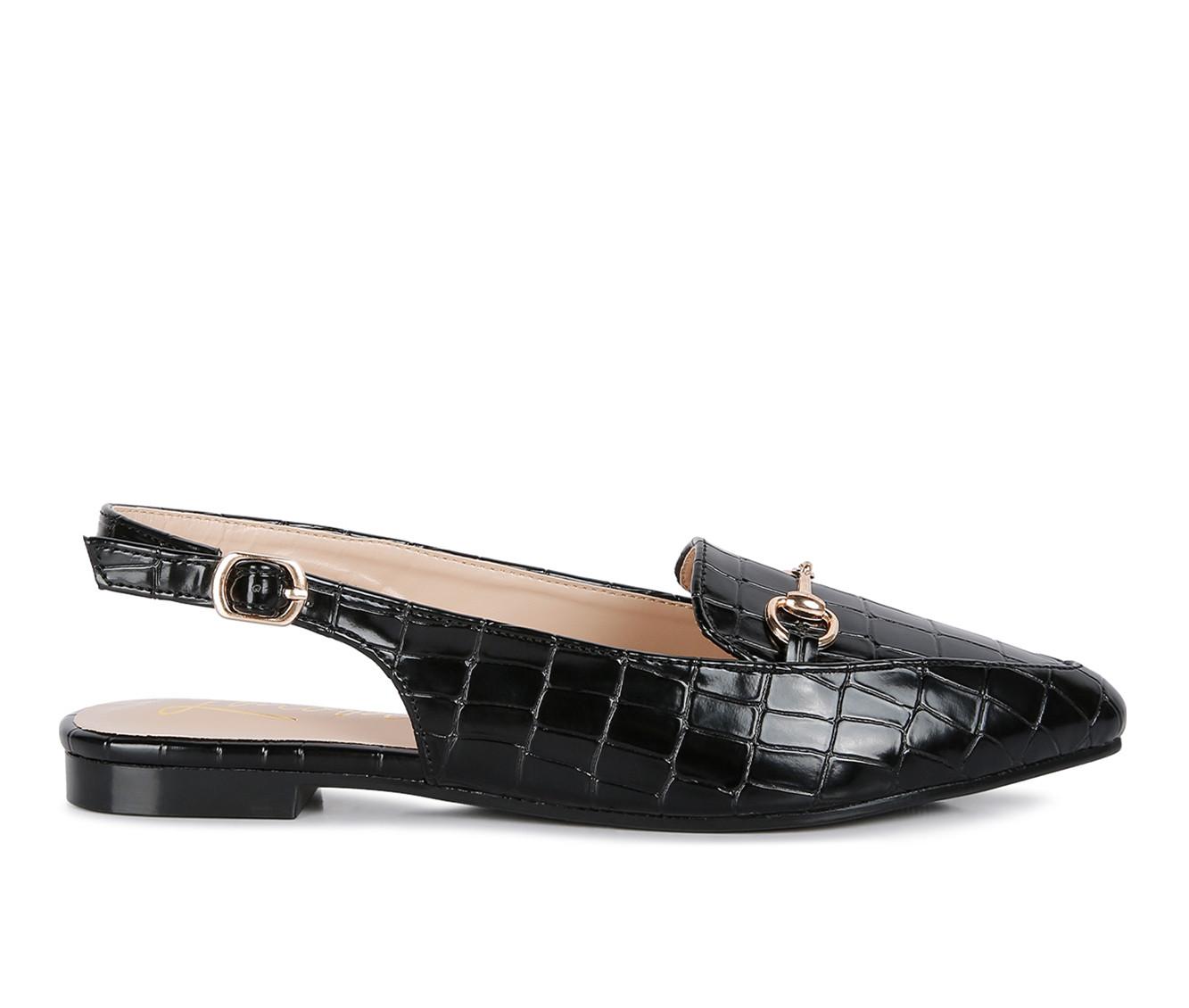 Women's London Rag Trempe Flats Croc Textured flat sandals with pin and buckle fastening slingback strap. The lightly cushioned insole cuts stress. Casual flat womens sandal for all day wear. It has metallic cling which adds just right bling.