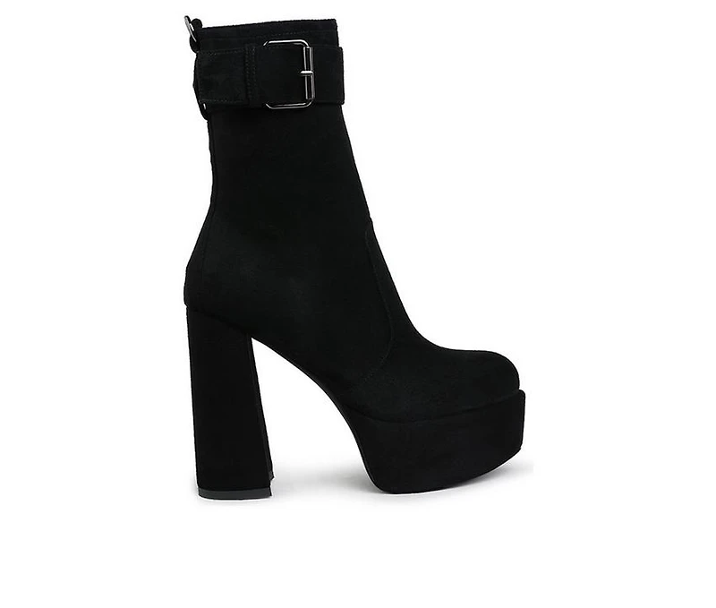 Women's London Rag Wanderer Heeled Boots Striking height and Western-inspired edge define these mid-calf boots. Designed with a microfiber upper and a closed round toe, this silhouette delivers structured coverage with bold lift. The side zipper closure allows for easy entry, while the high flared block heel and elevating platform detail create dramatic dimension. Finished with buckle belt detail and a durable TPR outsole, this pair blends rugged influence with statement style.