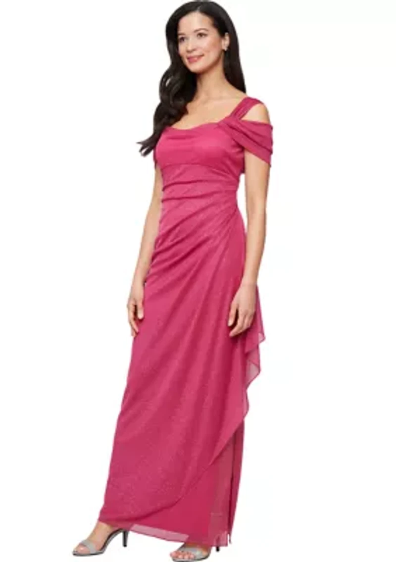 Glistening with glitter, this cold shoulder dress from Alex Evenings is further enhanced with side ruch detailing for a draped yet polished look. Zip closure Square neck Short cold shoulder sleeves Lined Dresses must be in original condition, with all tags attached. No refunds after 45 days. Imported Product Specifications 53.25'' L Material & Care Polyester Hand wash
