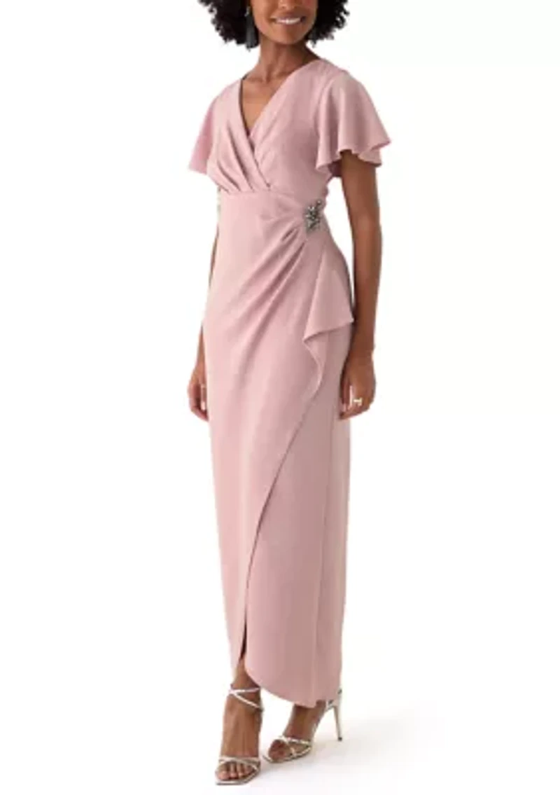 Long Empire Waist Dress with Surplice Neckline, Flutter Sleeves, Embellishment Detail at Hip and Cascade Skirt Zip closure Crossover V-neck Short flutter sleeves Unlined Imported Product Specifications 56" L Material & Care Polyester, spandex Hand wash