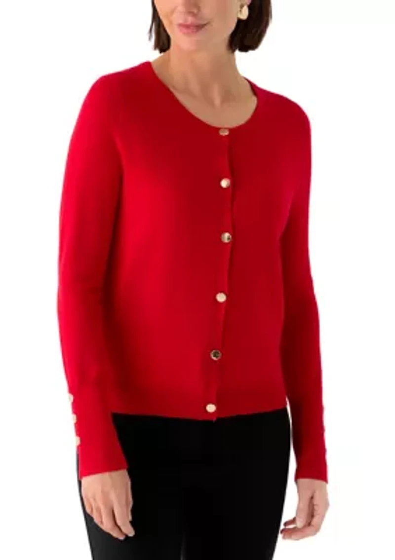 This T TAHARI cardigan is perfect for any occasion, featuring a charming button front design for a chic look all day long. Button closure Crew neck Long sleeves Imported Product Specifications 23" L Material & Care Rayon, nylon, spandex Machine washable