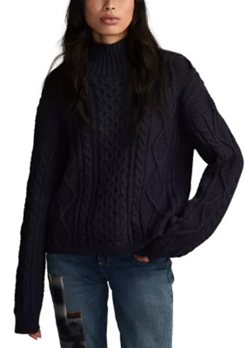 This Lucky Brand mock neck sweater seamlessly combines comfort and style. Its drop-shoulder sleeves and flattering fit make it perfect for everyday wear, providing a cozy, confident look all day long. Pullover Turtleneck Long drop shoulder sleeves Unlined Imported Product Specifications 23" L Material & Care 100% cotton Machine washable