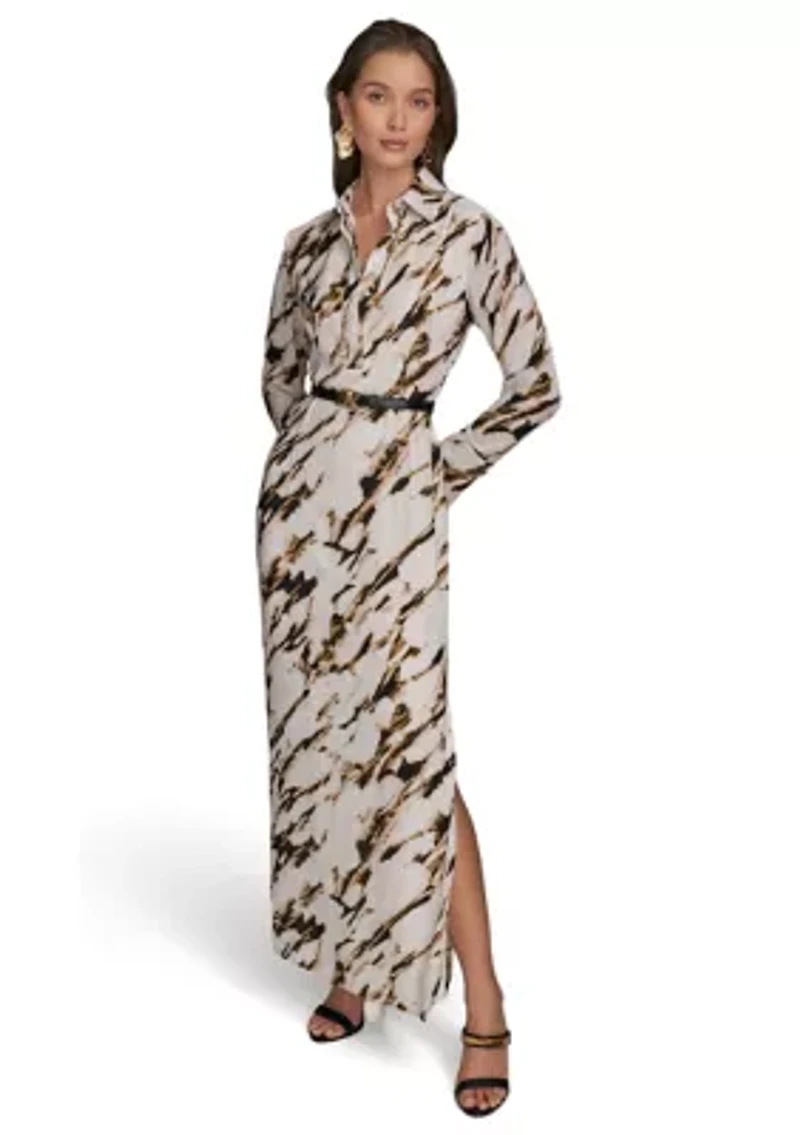 An abstract print adds artistic style to this elegant long sleeve maxi dress from Donna Karan New York. Zip closure Collar Long sleeves Lined Imported Product Specifications 57" L Material & Care Polyester Dry clean only