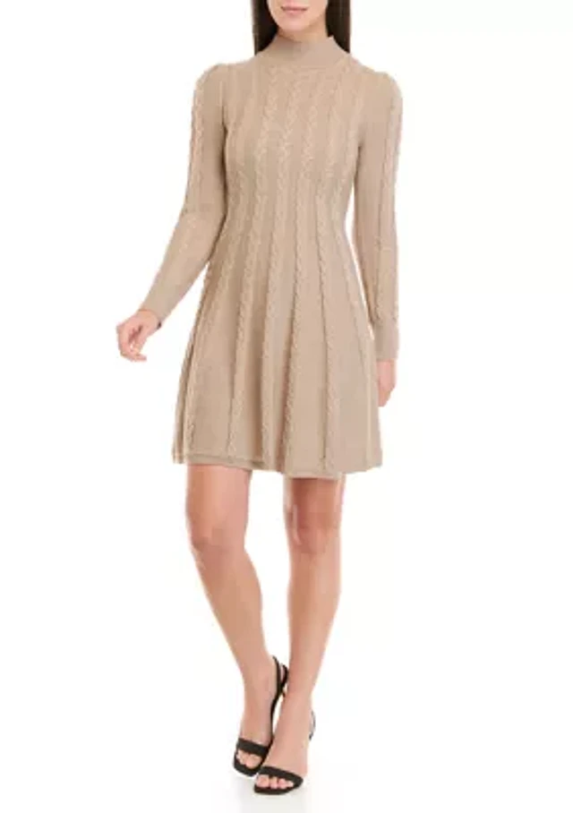 Women's Long Sleeve Mock Neck Cable Fit and Flare Sweater Dress