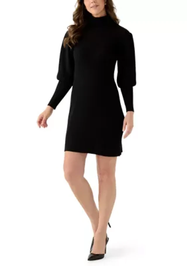 Hope & Henry Women's Long Puff Sleeve Mock Neck Sweater Dress