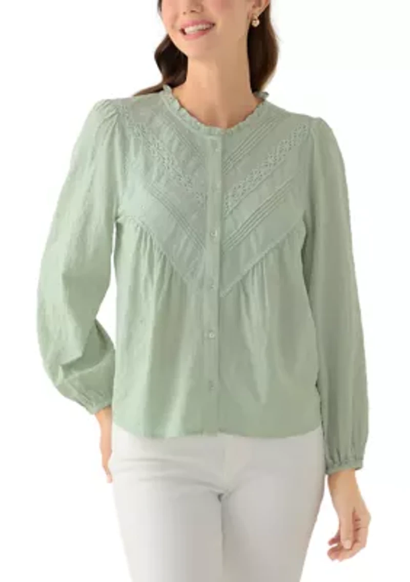 Ideal for pairing with denim, this lovely blouse from Wonderly features a button-front and pleated yoke for the perfect vintage-inspired style. Button closure Crew neck Long sleeves Imported Belk Exclusive Product Specifications 25" L Material & Care 100% cotton Machine washable