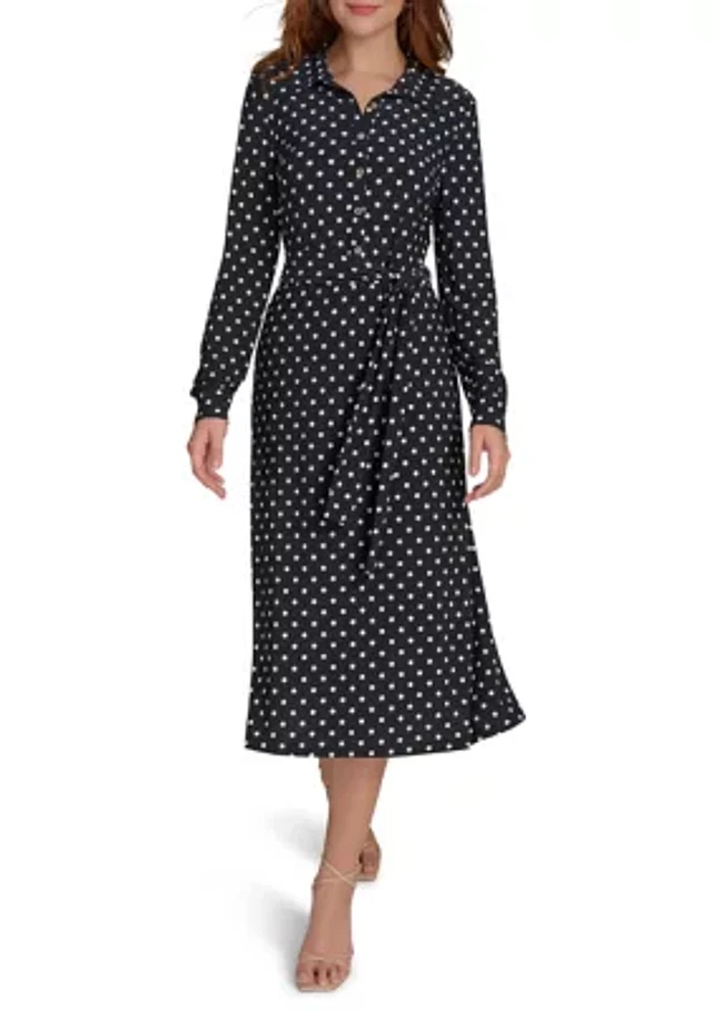 Women's Long Sleeve Self Tie Dot Jersey Shirtdress