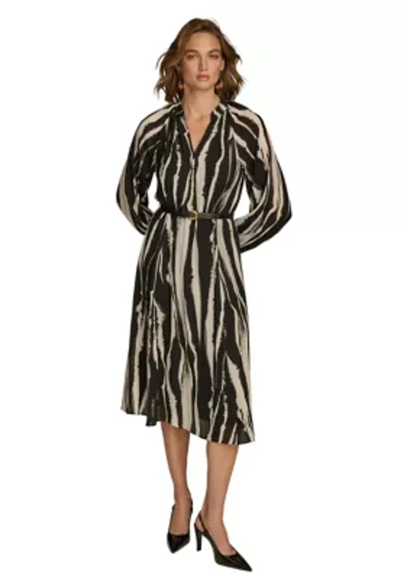 Complete with billowy blouson sleeves, this fit-and-flare dress from Donna Karan is decked out in bold stripes. Button closure V-neck Long blouson sleeves Lined Imported Product Specifications 47.75" L Material & Care Polyester Dry clean only