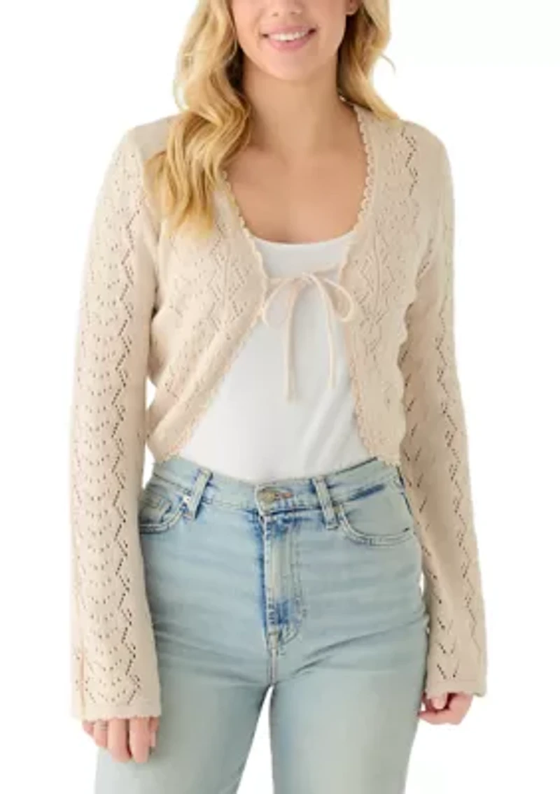 This Pink Rose cardigan is a cozy yet stylish layering piece. Featuring a flattering tie‑front detail and long sleeves, it offers both warmth and versatility. Tie closure V-neck Long sleeves Unlined Imported Product Specifications 17" L Material & Care Cotton, acrylic Hand wash