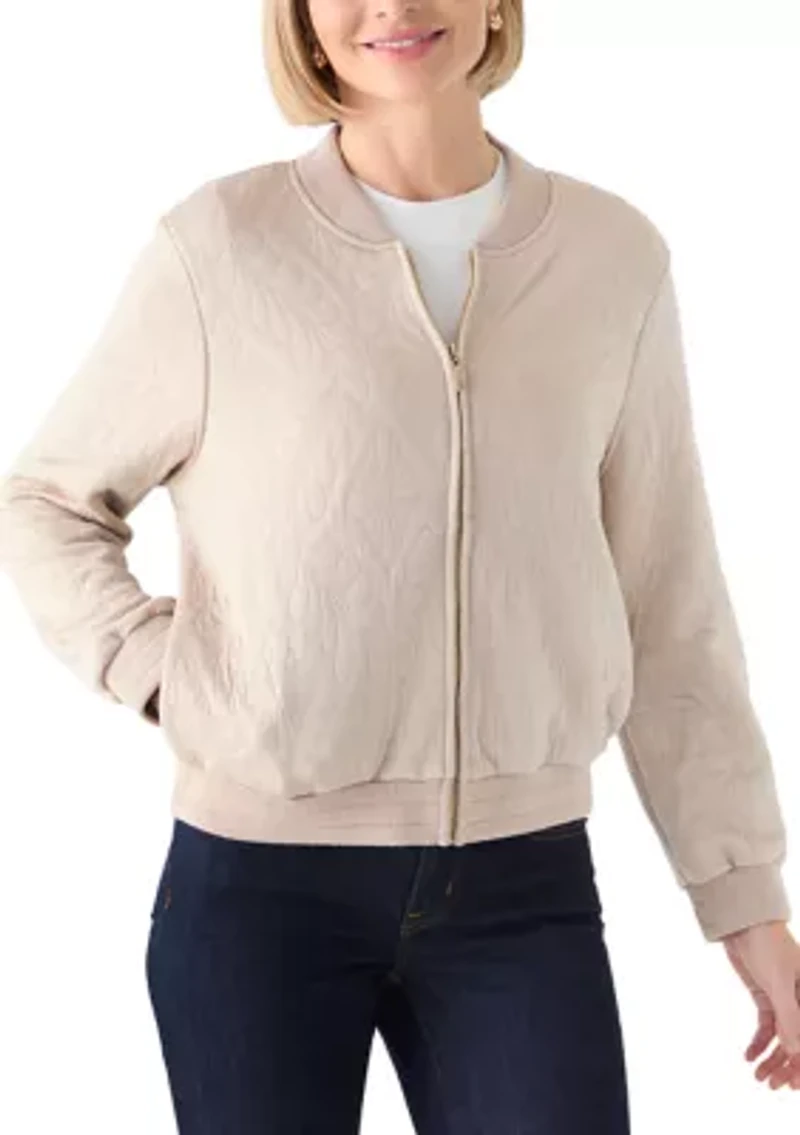 With a softly quilted texture featuring a medallion pattern, this Alfred Dunner bomber jacket adds warmth and style to cooler days. Designed with a mandarin neckline, zip front, full-length sleeves and a straight hem, it's a polished layer made for easy, everyday wear. Zip closure Collared neck Long sleeves Unlined Imported Product Specifications 22" L Material & Care Polyester, rayon, spandex Machine washable