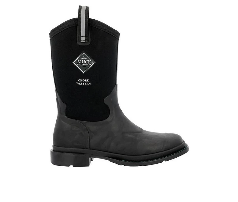 Women's Muck Boots Muck Women's Chore Western Cowboy Boots Blending rugged function with western-inspired design, this waterproof boot is built to work as hard as you do. The 12" silhouette features a square toe and pull-on straps for easy wear, while the 5mm neoprene bootie ensures a flexible, comfortable fit. Reinforced at key points with rubber overlays and a saddle vamp, it delivers extra durability where it counts. With a quick-clean outsole designed to shed debris and a lower lug profile that won’t catch in stirrups, this boot keeps you steady in any setting.