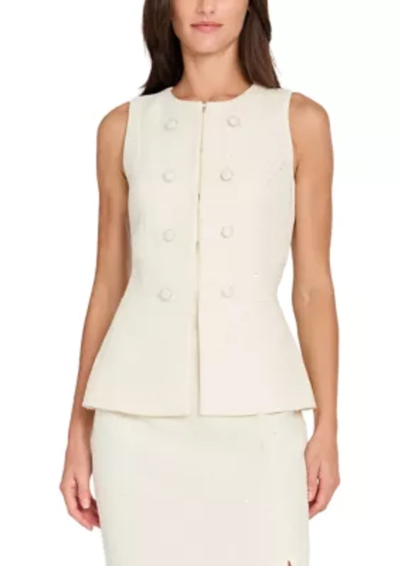 This bouclé vest from Tahari ASL blends classic texture with modern structure. Featuring a sleek hook and eye closure and tailored silhouette, it’s perfect for layering and elevating any look with refined style. Hook and eye closure Crew neck Sleeveless Lined Imported Product Specifications 24.5" L Material & Care Polyester, rayon Dry clean only