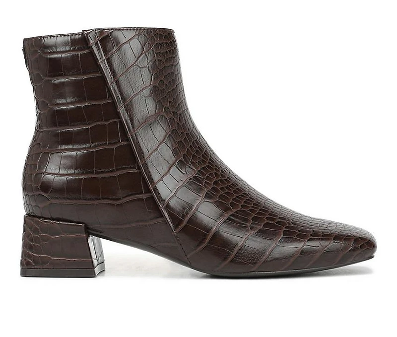 Women's Naturalizer Hadley Booties Bold and modern, this ankle bootie delivers statement style with sneaker-level comfort. A sleek faux-leather upper, square toe, and angled block heel create a sharp, fashion-forward silhouette, while the side zipper keeps entry effortless. Inside, REZORB™ responsive cushioning absorbs impact and Contour+ Comfort technology supports a premium, foot-hugging fit. Partially bio-based footbeds with built-in arch support and a molded heel cup make all-day wear a breeze.