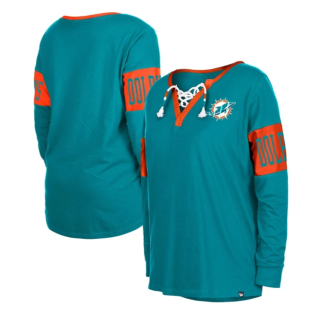 Women's New Era Aqua Miami Dolphins Lace-Up Notch Neck Long Sleeve T-Shirt