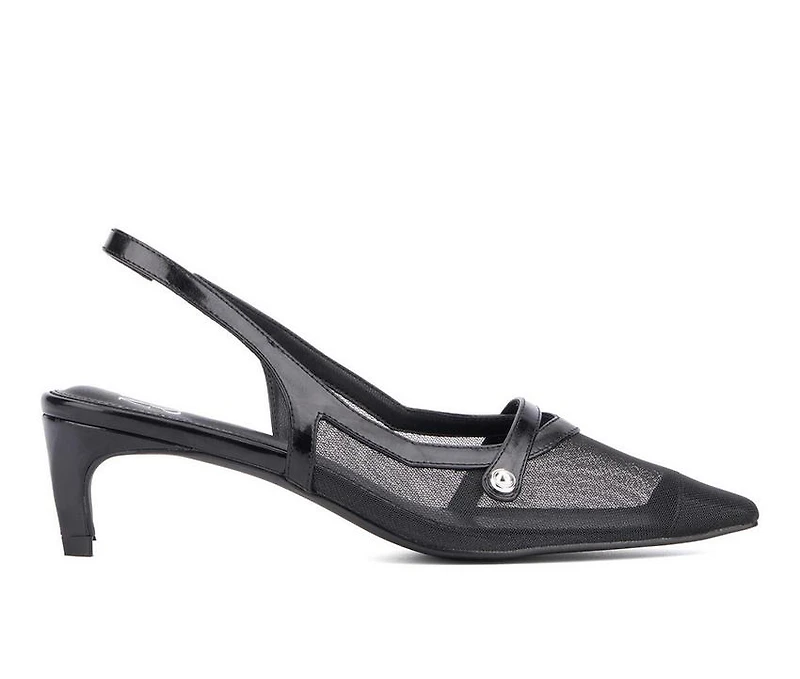 Women's New York and Company Kristie Slingback Pumps The Kristie kitten heel is a delicate fusion of grace and sophistication. Crafted with airy mesh fabric, this exquisite shoe showcases a sleek pointy toe silhouette, exuding effortless charm. With a modest kitten heel for added elegance, this stylish mesh kitten heel is the epitome of understated beauty, perfect for any occasion.