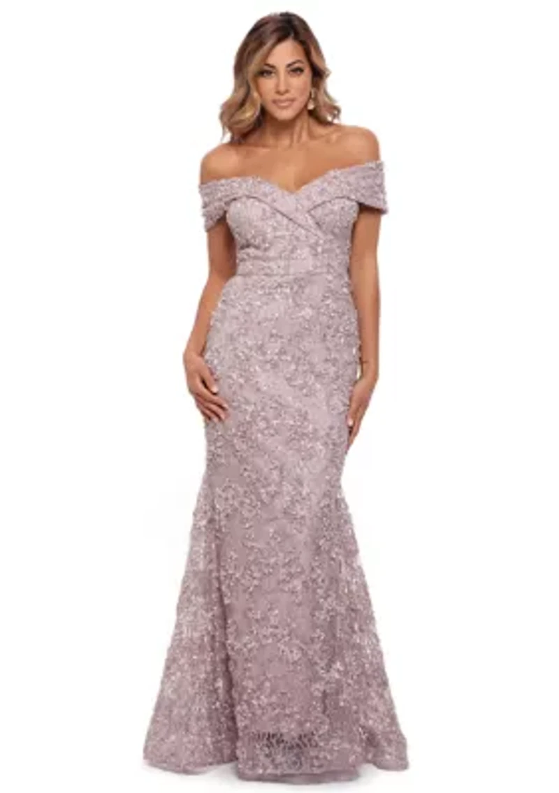 Lovely lace detailing romanticizes this off-the-shoulder dress from Xscape. Zip closure Sweetheart neck Short off-the-shoulder sleeves Fully lined Imported Product Specifications 62" L Material & Care Nylon Spot clean only