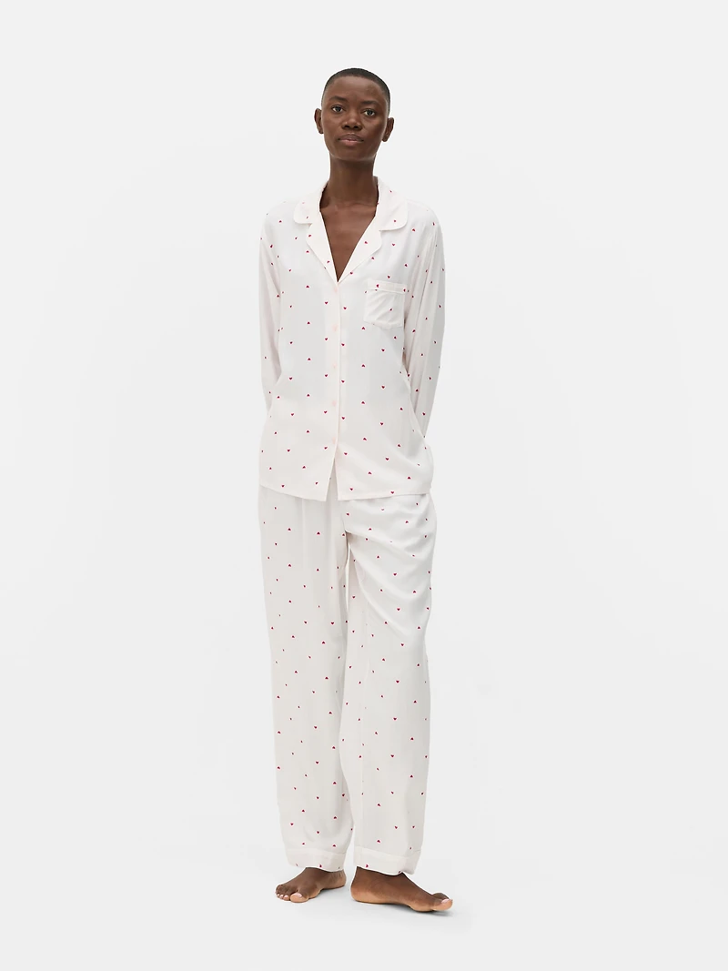 Striped twill pajama set with a button down top and relaxed full length pants