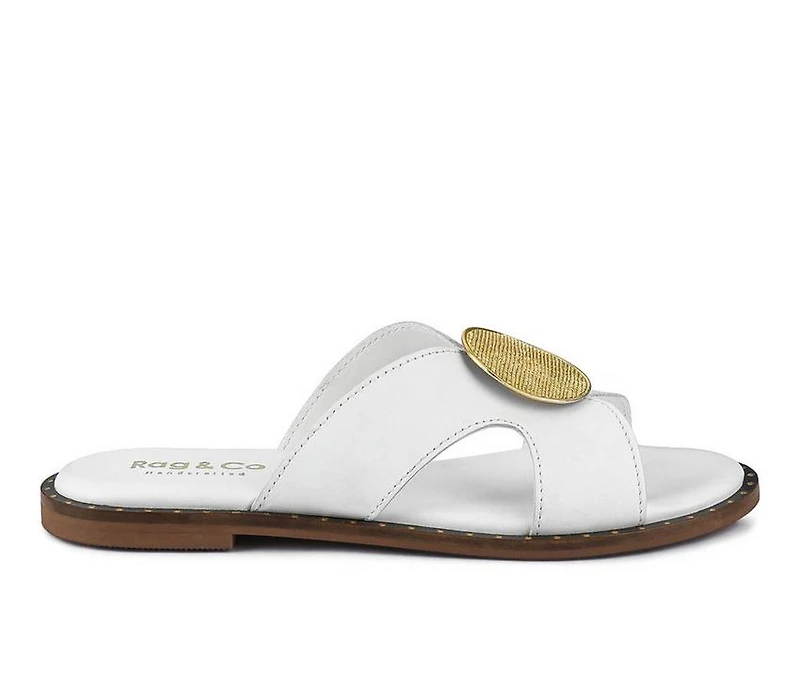 Women's Rag & Co Eudora Sandals The metal embellishment enhances the overall aesthetic of the leather slip-on sandals. The tiny studs along the insole frame give it a lovely finish. The cushion insoles offer comfort while the X cut-out detail is visually appealing. They are easy to wear and look chic and fashionable.