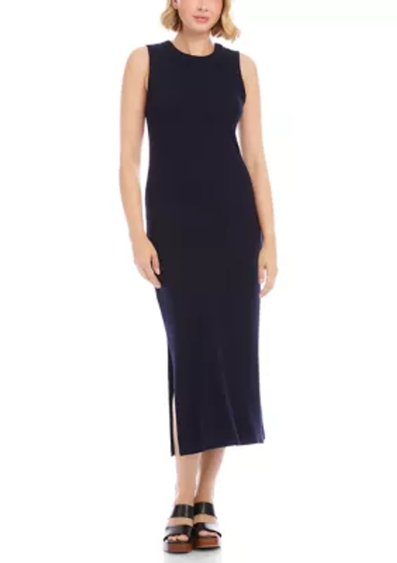 Karen Kane's sleek sleeveless midi dress is crafted in a wide rib knit for a flattering, body-skimming fit. Designed with a clean column silhouette, pull-on styling, a side slit and effortless stretch, this versatile style transitions easily from day to night. Hand wash cold, lay flat to dry or dry clean 94% viscose, 6% spandex Made in the USA Pullover Crew neck Sleeveless Unlined Product Specifications 48.5" L