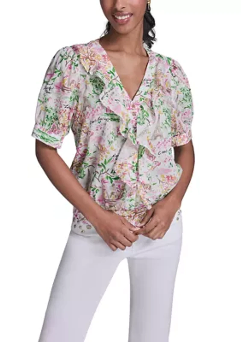 This KARL LAGERFELD PARIS ruffle blouse features charming short puff sleeves and a classic button-front closure for a polished yet feminine look. Delicate ruffle details add soft texture, making it perfect for pairing with tailored pants or your favorite denim. Button closure V-neck Short puff sleeves Unlined Imported Product Specifications 22" L Material & Care 100% cotton Machine washable
