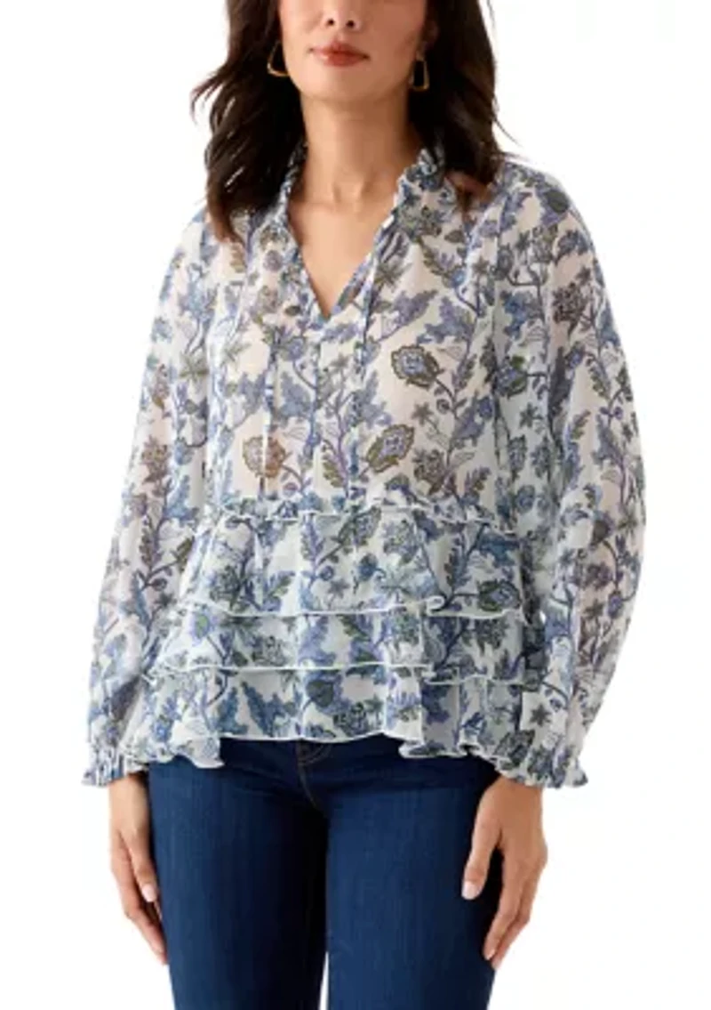 Ruffled sleeves and a tie at the neckline add style and charm to this printed peasant top from Wonderly. Pullover Split neck Long ruffle sleeves Imported Belk Exclusive Product Specifications 26" L Material & Care 100% polyester Machine washable