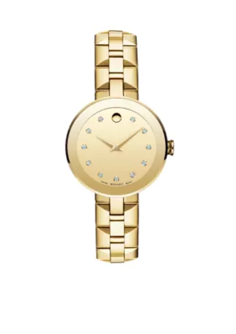 Women's Sapphire watch, 28.0 mm yellow gold-plated stainless steel bezel-free case, flat edge-to-edge sapphire crystal with a ring of gold metallization, round gold mirror dial with 11 diamond markers (0.042 t.c.w.), gold-toned signature concave dot and dauphine hands, yellow gold-plated stainless steel pyramid-shaped link bracelet with butterfly deployment clasp, sapphire crystal, Swiss quartz movement, water resistant to 30 meters. 28-mm. Case Size Butterfly deployment clasp Round dial; Swiss quartz movement Water resistant to 30 Meters Imported