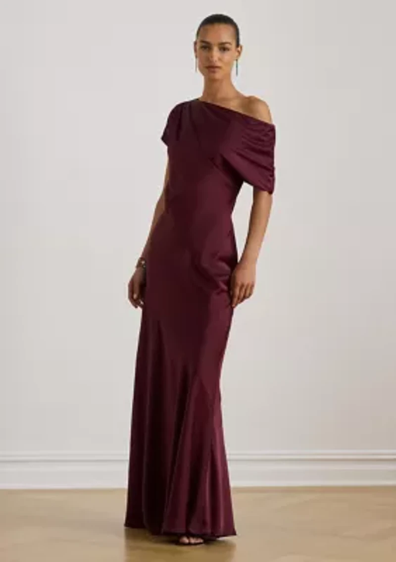 Designed with an asymmetrical off-the-shoulder neckline and a floor-length silhouette, this gown is crafted from satin charmeuse for a beautiful sheen and graceful drape. Slim fit with a subtle flared skirt. Intended to hit at the floor. US size 8 has a 61.75" body length. Dress length is taken from the high point of the shoulder and changes 0.5" between sizes. Asymmetrical off-the-shoulder silhouette. Pull-on styling. Short sleeves. Pleats gather at the shoulder seams. Bias-cut skirt. Bias-cut skirt. Full georgette lining. Shell and lining: 100% polyester. Hand wash or dry clean. Imported. Model is 5'10" (178 cm) and wears a US size 4. Imported