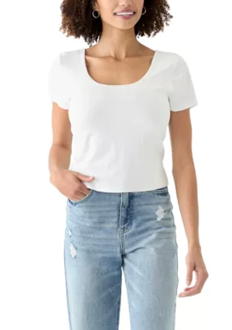 This jersey t-shirt will pair perfectly with your best bottoms, shoes, and accessories. Pullover Scoop neck Short sleeves Unlined Imported Product Specifications 20" L Material & Care Polyester, spandex Hand wash