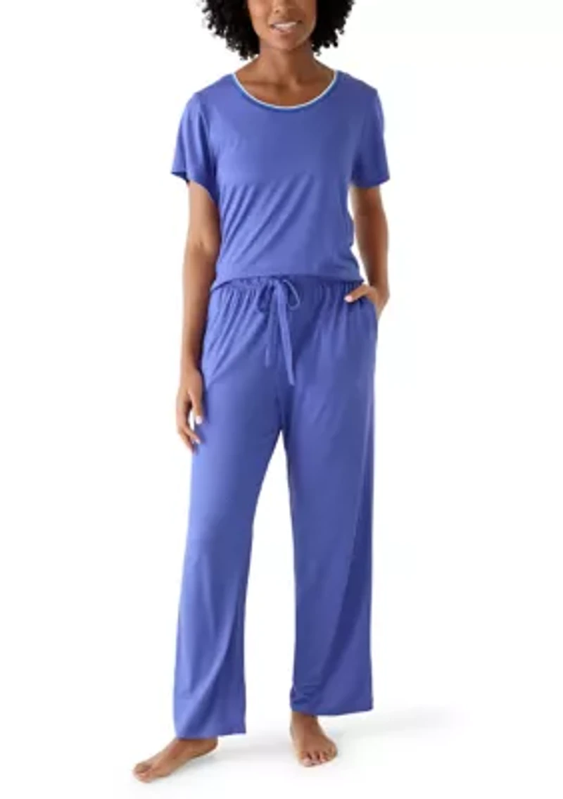 Stay effortlessly chic in this Kim Rogers® set, featuring a short-sleeve top and matching pants with subtle ribbed detailing for a flattering, streamlined fit. 2-piece set Pullover Crew neck Short cap sleeves Imported Belk Exclusive Product Specifications 29" inseam Material & Care Polyester, spandex Machine washable