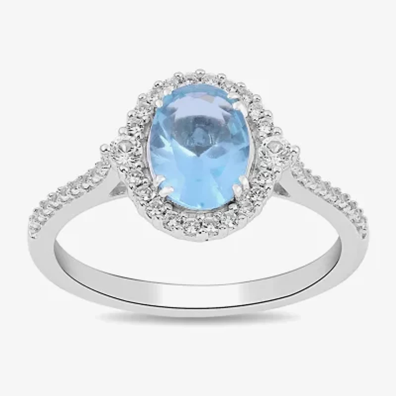 Womens Simulated Blue Aquamarine Sterling Silver Halo Side Stone Cocktail Ring