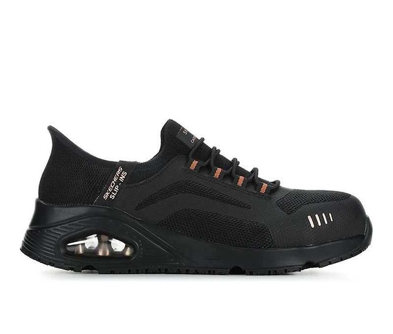 Women's Skechers Work 108217 Air ESD Work Shoes The Women’s Skechers Work Air ESD brings sporty comfort and advanced protection to every shift. Designed with a breathable mesh-like upper and a Carbon Nano Safety Toe, this work shoe offers lightweight durability and lasting support. Its slip-on design with stretch panels makes for easy wear, while the Air-infused midsole and Memory Foam insole deliver cushioned comfort with every step. A slip-resistant traction outsole keeps you steady on the job.
