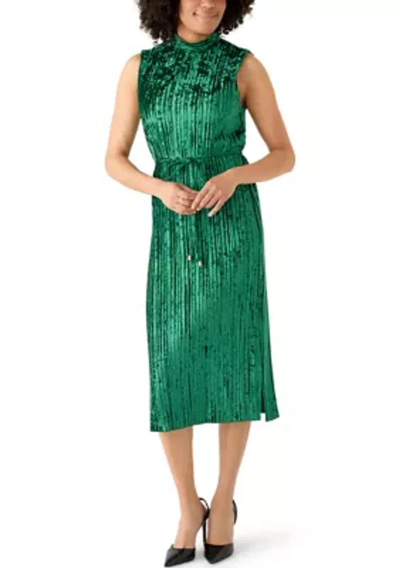 Slip into sophistication with this midi dress from Emma & Michelle, where timeless elegance meets modern edge. Crafted from plush velvet with a subtle sheen, this dress hugs in all the right places while offering a soft, luxurious feel. Keyhole with button closure Mock neckline Sleeveless Self-tie belt Unlined Imported Product Specifications 48" L Material & Care Polyester, spandex Machine washable