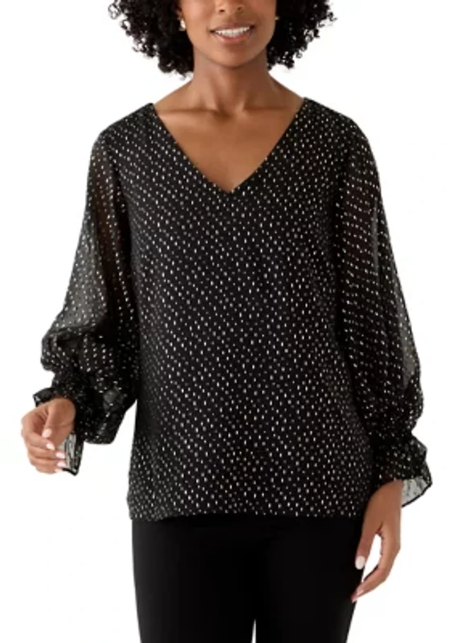 Petite Long Sleeve Ruffle V-Neck Smocked Dot Blouse