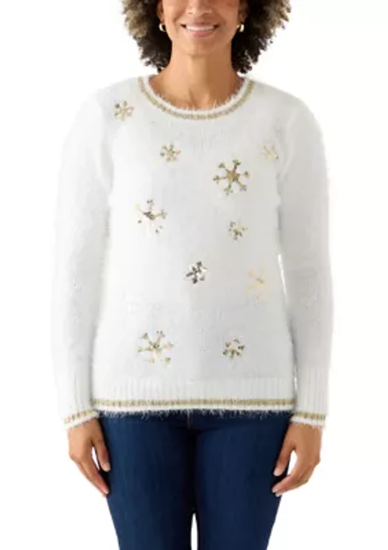 Celebrate the season in style with the Joyland snowflake sweater, perfect for adding festive charm to your holiday wardrobe. Pullover Crew neck Unlined Imported Belk Exclusive Product Specifications 26" L Material & Care Polyester Hand wash