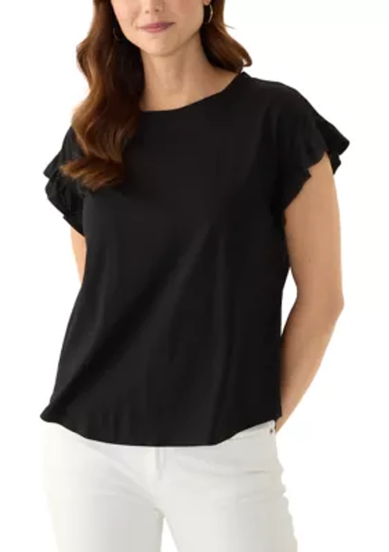 Ruffled cuffs along each sleeve add a touch of femininity to this solid crew-neck t-shirt from Crown & Ivy™. Pullover Crew neck Short flutter sleeves Imported Belk Exclusive Product Specifications 24" L Material & Care Cotton, modal Machine washable
