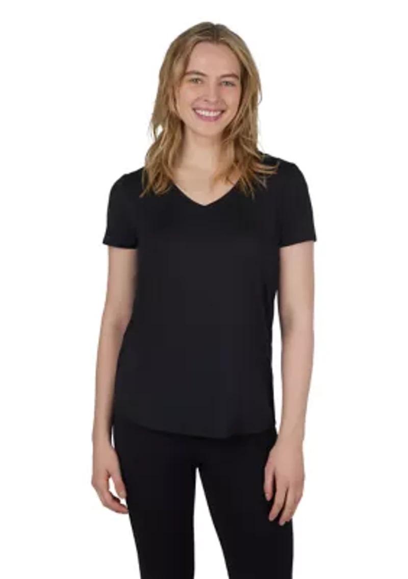 Lightweight and comfortable, this solid V-neck t-shirt from Yogalicious is an essential choice for active occasions. Pullover V-neck Short sleeves Unlined Imported Product Specifications 25.5" L Material & Care Polyester, spandex Machine washable