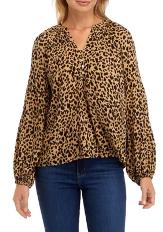 Petite Long Sleeve Split Neck Printed Peasant Top