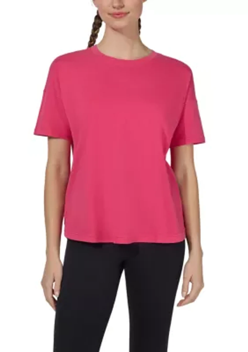Featured in a boxy, cropped fit, this tee from Yogalicious pairs perfectly with high-waisted leggings and sneakers. Pullover Collar Short drop shoulder sleeves Unlined Imported Product Specifications 25" L Material & Care Nylon, spandex Machine washable