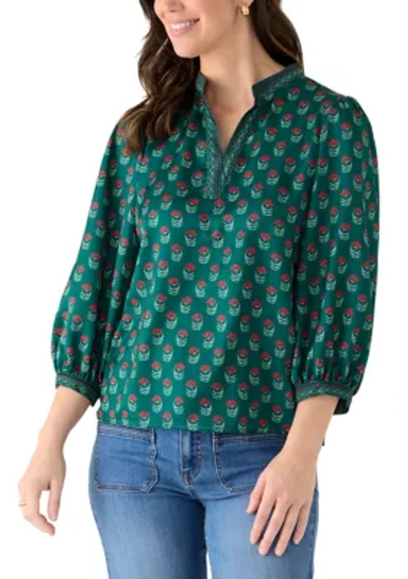 This Mary Square blouse is perfect for any occasion, featuring flowing sleeves and a stylish print for a chic look all day. Pullover Split neck Long blouson sleeves Imported Product Specifications 24.5" L Material & Care 100% polyester Machine washable