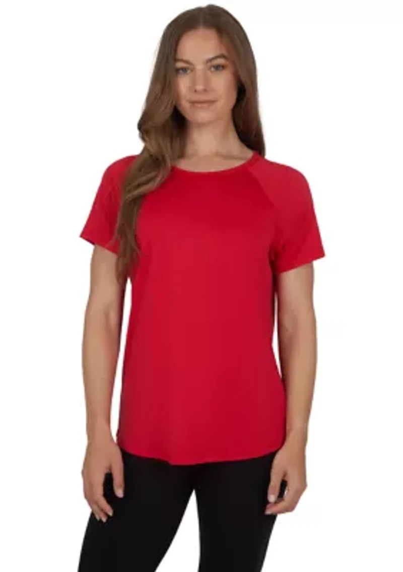 Designed for classic comfort, this short-sleeve t-shirt from Yogalicious is an ideal addition to your athleisure collection. Pullover Crew neck Short sleeves Unlined Imported Product Specifications 26'' L Material & Care Polyester-spandex blend Machine washable