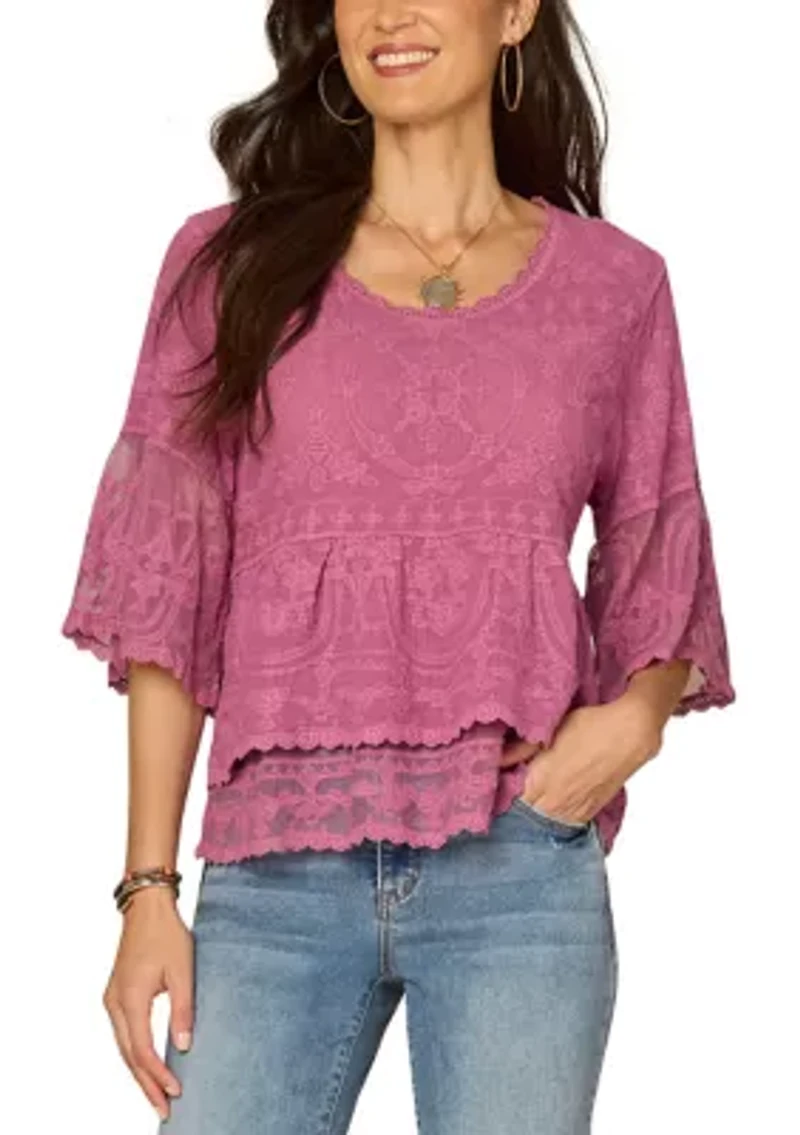Women's Three-Quarter Bell Sleeve Embroidered Double Flounce Peplum Top in Franklin, TN
