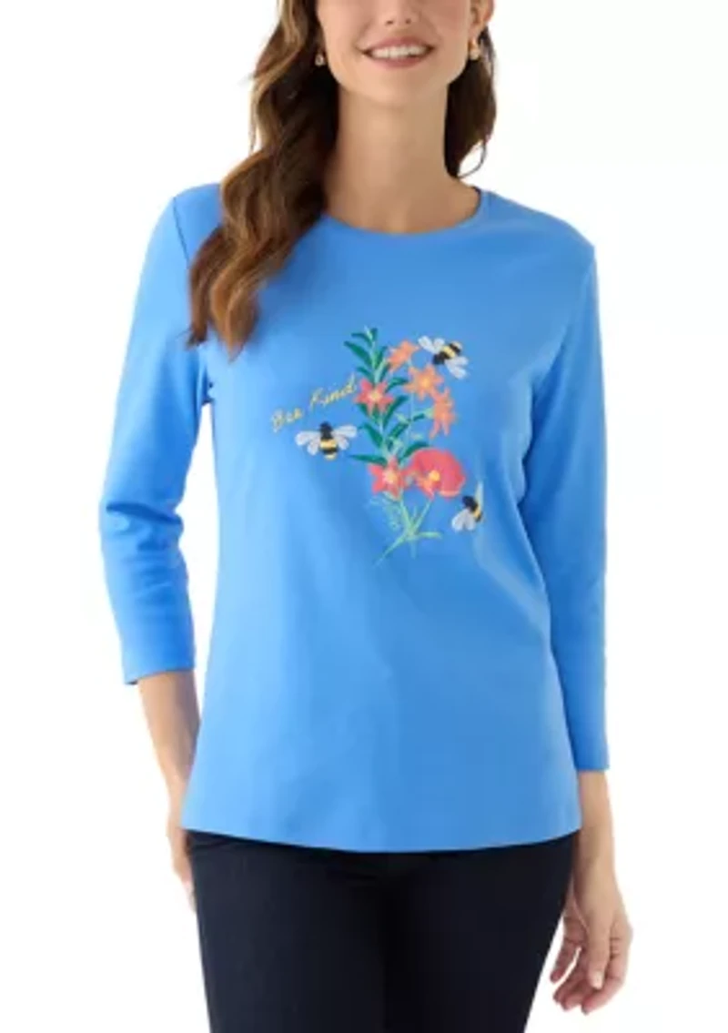 This Kim Rogers® t-shirt features a stylish graphic design and a classic crew neckline for a casual, trendy look. Pullover Crew neck Three-quarter sleeves Imported Belk Exclusive Product Specifications 27" L Material & Care 100% cotton Machine washable
