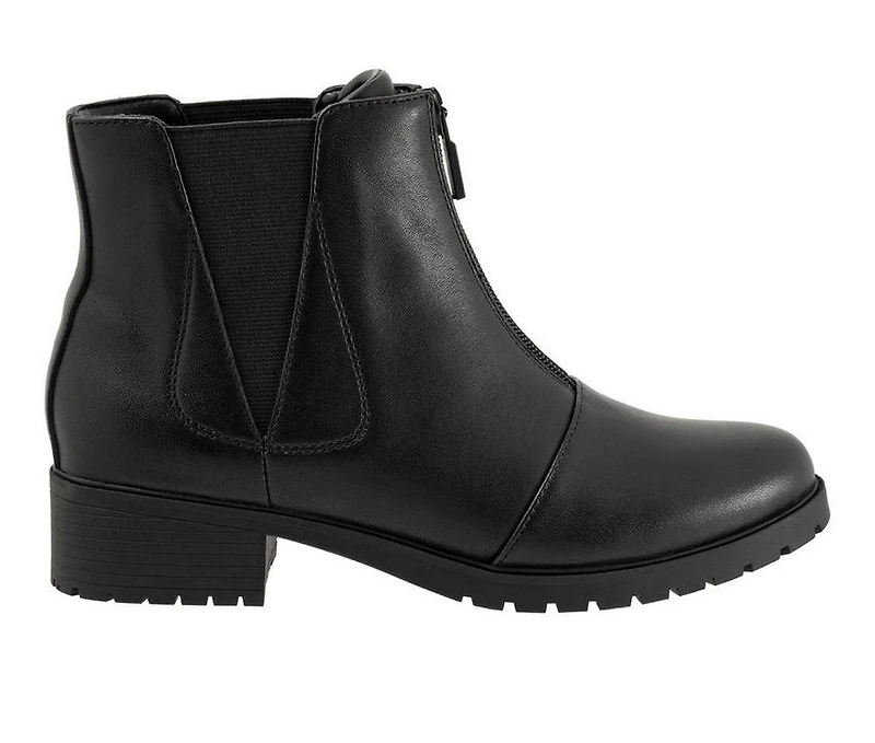 Women's Trotters Marni Booties Designed for everyday wear, this ankle boot blends practicality with timeless polish. Featuring elastic goring for a flexible fit and a front zipper for quick entry, it offers easy convenience without sacrificing style. A memory foam footbed with removable insert delivers lasting comfort and support. Finished with a modest 1 1/2" heel and round toe design, this boot is perfect for pairing with both casual and refined outfits.