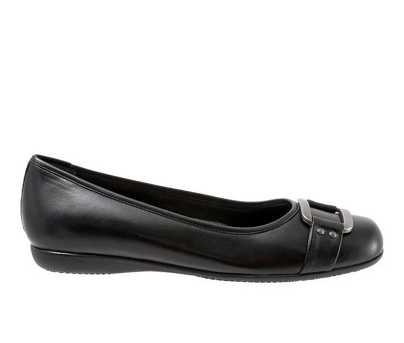 Women's Trotters Sizzle Signature Flats The ballerina flat, Sizzle, is dressed up with classy metal ornament buckle detail covering the toe. A great everyday walking tailored flat for work or play. Suede Metallic colors have a man made microfiber suede upper with painted metal buckle detail on toe.